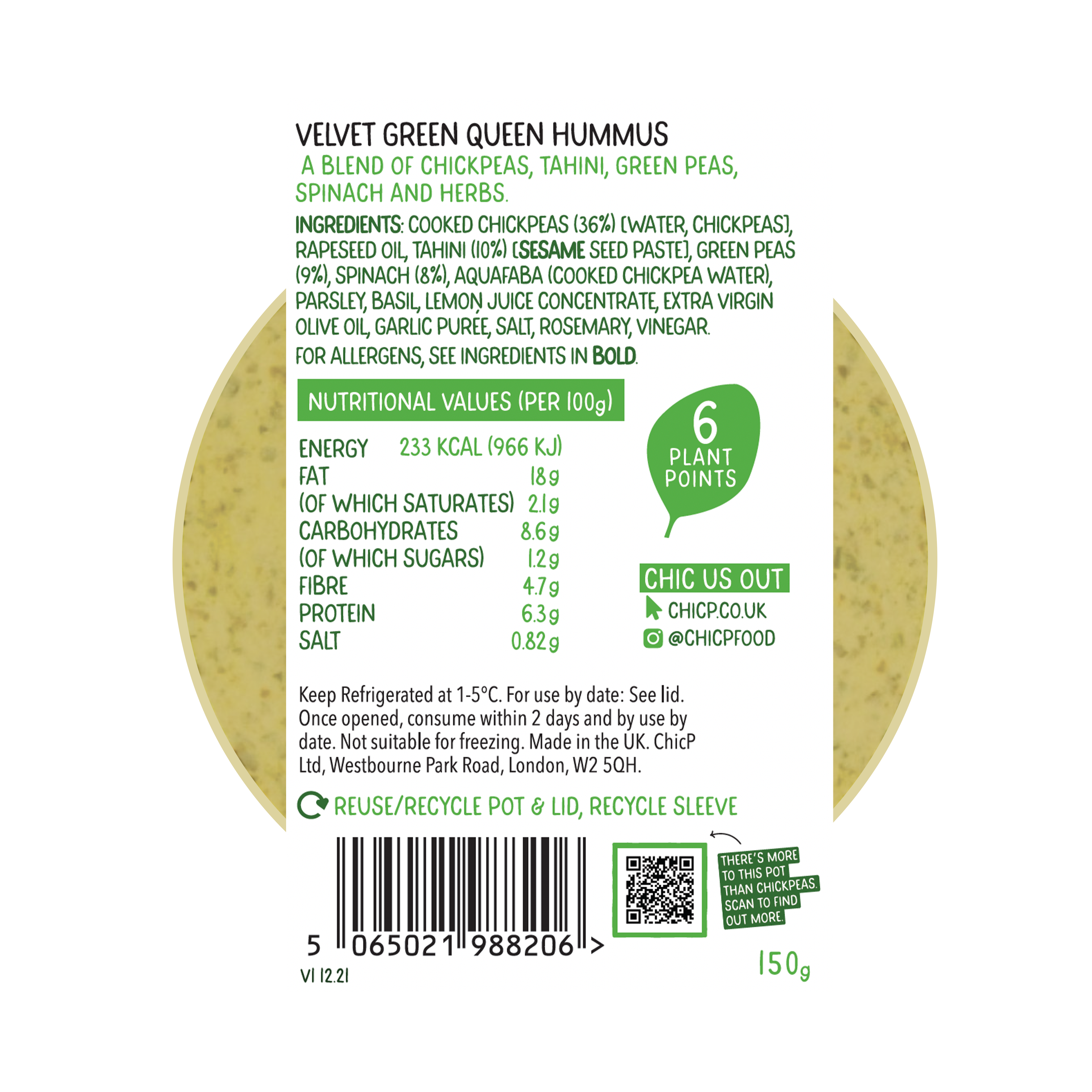 Green Queen is ChicP’s vibrant, herb-led Green Goddess style hummus, crafted in the UK with chickpeas, green peas, spinach, parsley, basil and 100% extra virgin...